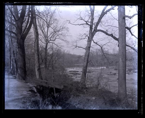 Glass negative showing a distant view of a dam on the Brandywine Creek. The creek rushes over rocks seen from the tree-lined bank. A wooden walkway spans a small gap between the path and the bank.