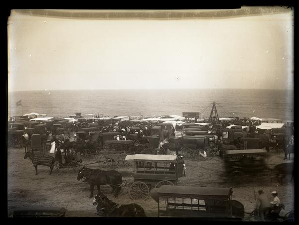 Film negative showing a large group of horse-drawn carts, wagons and people gathered on the beach for Jersey Wash Day. Canopies are strung over stalls near the shore. The ocean extends into the background. Jersey Wash Day, also known as Salt Water Day or Ocean Day, was an annual event held the second Saturday of August near Wreck Pond in Sea Girt. Farmers living twenty to thirty miles from Sea Girt came to the sea to spend a day bathing and celebrating. The tradition, begun before 1853, stopped around the 1930s.