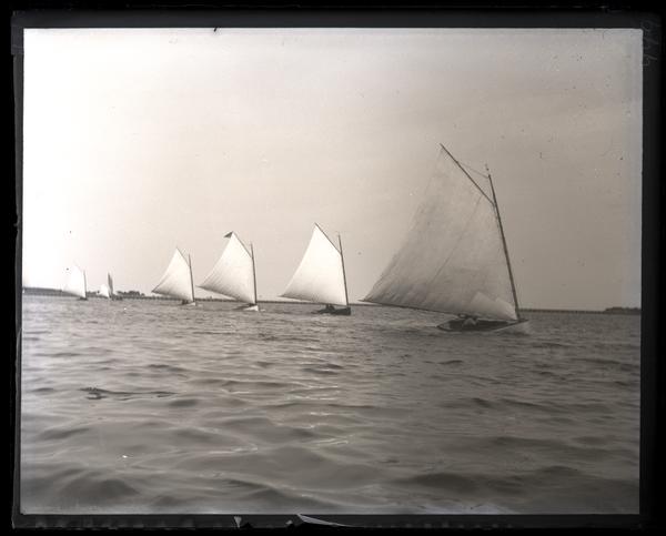 Glass negative showing various sailboats traveling on Manasquan River, a wide river with choppy water. The boats sail in a diagonaly line away from the distant shoreline.