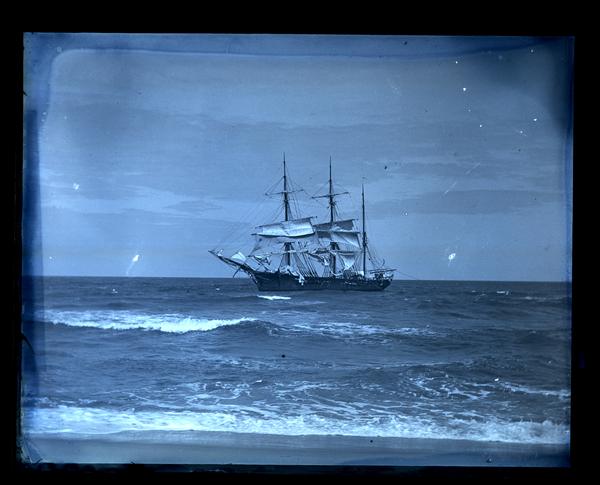 Glass negative showing the "Civitas Canaria," a large sailboat on the ocean at Manasquan, N.J. The boat has three masts and is seen from the beach across choppy water.