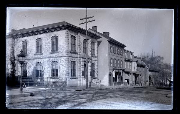 Glass negative showing a view of the National Bank at 5504 Germantown Avenue, a two-story stone building with an elaborate cornice and decorative iron bars over the windows designed by James Charles Sidney (1819-1881). Trolley tracks run down the center of the brick road. A telephone pole stands in front of the bank and a lamp post stands on the corner to the left. Other buildings line the road to the right. The National Bank of Germantown was chartered by the state of Pennsylvania in 1813 and began operations in 1814 in the parlor of the house of Dr. Charles Bensell. The bank built a new building on this site in 1868. The building was altered in 1890, 1907, and 1930.