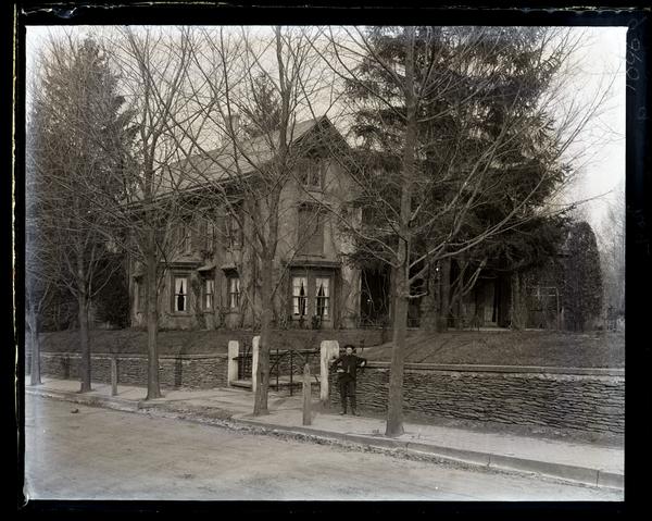 Glass negative showing a house, previously owned by the Morris family, at Church Lane and Chew Streets in Philadelphia. Trees surround the house. A young man leans against the low stone wall in front of the house next to a hitching post and gate.