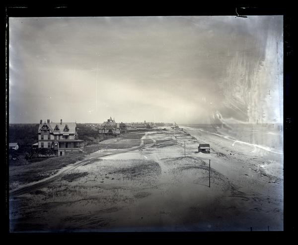 Glass negative showing the ocean shore at Sea Girt taken from the third story of the Beach House. Waves break on the right and a series of large homes stand on the left along the dunes. Flagpoles and a small wooden building stand between the large houses and the shore.