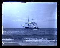 Glass negative showing the "Civitas Canaria," a large sailboat on the ocean at Manasquan, N.J. The boat has three masts and is seen from the beach across choppy water.