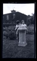 Film negative showing Marriott C. Morris' sons Elliston Perot Morris Jr. and Marriott Canby Morris Jr. as boys standing next to a stone sundial in the garden at their home at 131 W. Walnut Lane. Neat hedges and a building covered in ivy stand behind the boys.
