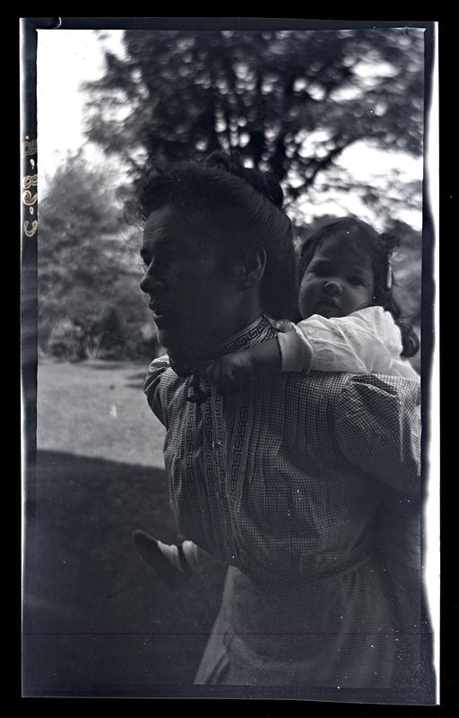 Film negative showing Marriott C. Morris' wife Jane Rhoads Morris wearing a checkered dress carrying their daughter Janet Morris as a young girl on her back through the garden at their home at 131 W. Walnut Lane. Janet Morris wears a white frock and ribbons in her hair.