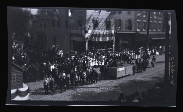 Film negative showing a group of boys walking in front of a float down Germantown Avenue in the parade for the 225th anniversary of the founding of Germantown. The float carries a man and the Shag Rag, Germantown's first fire engine. A sign on the side of the float reads "The Oldest Fire Engine And The Oldest Fireman." Spectators line both sides of the road. Patriotic bunting hangs from a building in the background. The original Bicentennial anniversary parade celebrated the first German immigrants to America and the first thirteen Quaker families who founded Germantown. A smaller annual holiday, German Day, began to be held in subsequent years in German-American communities. The Shag Rag was the oldest fire engine in America. Built by Newsham & Rag in England, it was brought to the United States in 1764 for the Middle Ward Fire Company of Germantown. The engine worked by both gathering water from wells and propeling water onto fires. It was in use up until 1822, when the Fellowship Fire Company deemed it too antiquated for use. In 1871, it was sold to William H. Emhardt, the president of the Germantown Mutual Fire Insurance Company.