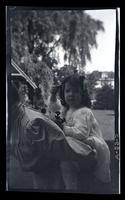 Film negative showing Marriott C. Morris' wife Jane Rhoads Morris wearing a checkered dress carrying their daughter Janet Morris as a young girl on her back through the garden at their home at 131 W. Walnut Lane. Janet Morris wears a white frock and ribbons in her hair. She raises her right hand and holds flowers in her left hand.