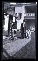 Film negative showing Marriott C. Morris' wife Jane Rhoads Morris with their children Janet Morris and Elliston Perot Morris Jr. on a garden path at their home at 131 W. Walnut Lane. Jane Morris wears a long dark coat and hat and holds Janet Morris' hand. Elliston Morris Jr. stands on a ladder propped against a lattice on the left. He wears gloves, a long dark coat, and a hat. Their house with a balcony on the second floor stands behind the group.