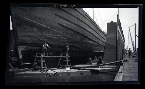 Film negative showing two men standing on scaffolding working on a large ship at the Philadelphia Ship Repair Company dry dock. Another man walks down the dock to the right.