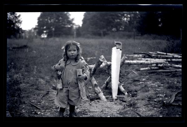 Film negative showing Marriott C. Morris' daughter Janet Morris as a young girl carrying two pieces of firewood at Pocono Lake. A saw is propped up against a makeshift sawhorse and a pile of wood stands behind her. The Pocono Lake Preserve was pioneered by a group of Quakers, including Isaac Sharpless, who camped in the area in 1904. In 1908, this group bought the property from the Pocono Mountain Ice Company and designed it as a basic, rustic campground.