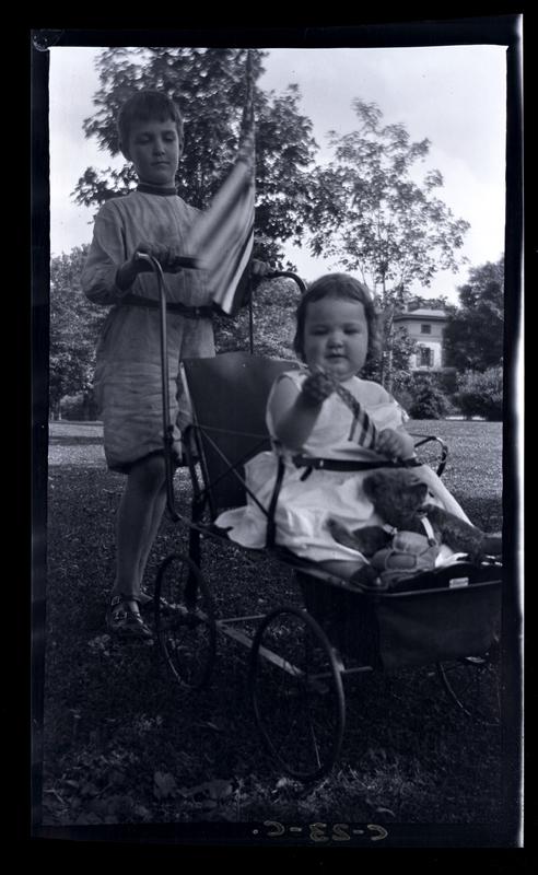 Film negative showing Marriott C. Morris' children Janet Morris and Elliston Perot Morris Jr. in the garden at their home at 131 W. Walnut Lane. Janet Morris as a baby wears a white frock and sits in a carriage with an American flag in her hand and teddy bear in her lap. Elliston Morris Jr. wears a uniform and pushes the carriage across the grass.