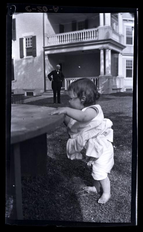 Film negative showing Marriott C. Morris' daughter Janet Morris as a baby propping herself up next to a wooden bench surrounding a tree at their home at 131 W. Walnut Lane. Morris' uncle-in-law Asa S. Wing stands near the entrance to the house in the background.