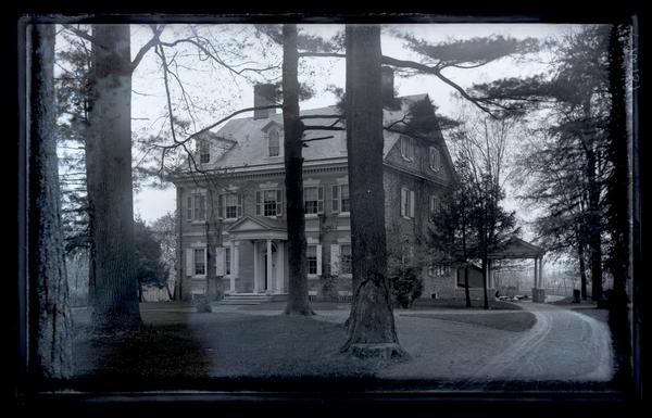 Glass negative showing Upsala, a large, two-story stone house with shuttered windows and a covered entryway adorned with a pediment at 6430 Germantown Avenue. Tall trees grow in the lawn as a drive circles in front of the house. Originally built by Dirk Jansen circa 1755, Upsala was the staging ground for the Continental army at the Battle of Germantown in 1777. The expanded house, built by Jansen’s descendant John Johnson III in 1798, remained with the Johnson family until 1941. The estate was purchased by the Upsala Foundation in 1944.