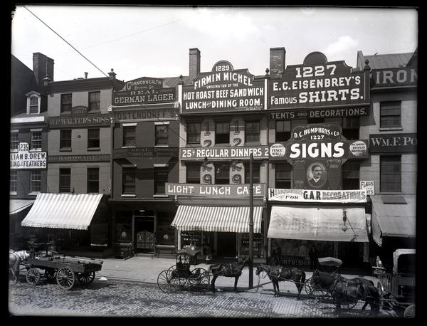 Glass negative showing a view of 1227-1235 Market Street. Horse-drawn carriages and carts stand on the cobblestone street. Awnings and large signs hang from the buildings. 1235 Market Street has a sign reading "[Wil]liam B. Drew, [...] and Feathers." 1233 Market Street has signs reading "Established 1831, W.P. Walter's Sons, 1233 Hardware 1233." 1231 Market Street has signs reading "Commonwealth Brewing Co., Real German Lager., Ostendorff's." 1229 Market Street has signs reading "Firmin Michel originator of the hot roast beef sandwich Lunch and Dining Room. D.C. Humphreys Adv. Sign Co., 1227 Market St., 25c Regular Dinners, Light Lunch Cafe." 1227 Market Street has signs reading "E.C. Eisenbrey's Famous Shirts., Tents and Decorations, D.C. Humphrys & Co. 1227 Signs, Headquarters for G.A.R. Decorations."