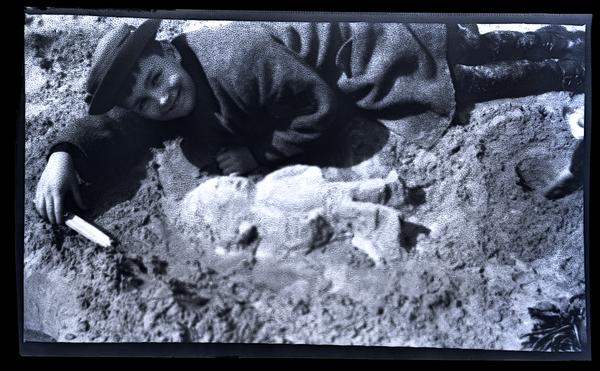 Film negative showing Marriott C. Morris' son Elliston Perot Morris Jr. as a boy laying in the sand next to the figure of a man he has built in the sand. Morris smiles and holds a stick in his right hand. He wears a coat and hat.