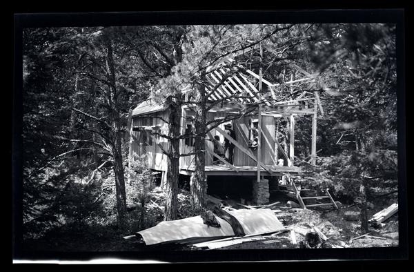 Film negative showing a wooden house under construction surrounded by trees at Pocono Lake. A group of people stand with their backs turned in the doorway. Building materials lie in piles in the foreground. The Pocono Lake Preserve was pioneered by a group of Quakers, including Isaac Sharpless, who camped in the area in 1904. In 1908, this group bought the property from the Pocono Mountain Ice Company and designed it as a basic, rustic campground.