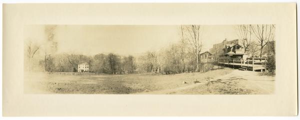 Triplicate panoramic views showing the train station built in 1878 after the designs of William Brown and Washington (sometimes listed William) Bleddyn Powell at 314 West Tulpehocken Street, Germantown. Men and women wait on the station platform in the right of the image. A car is parked next to the Victorian-style station building across from the platform on which the passengers wait. A multi-story building rises from behind the station. A rough-patched grassy pasture to the left of the station fills most of the image. Groves of trees and a three-story white building are also visible.