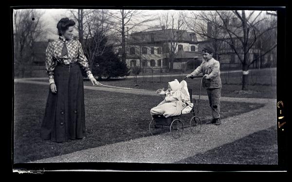 Film negative showing Marriott C. Morris's wife Jane Rhoads Morris and their children Marriott Canby Morris Jr. Janet Morris on a garden path at their home at 131 W. Walnut Lane. Marriott Morris Jr. wears a cap and tattered pants and pushes his siter in a carriage. Janet Morris wears a cap and is wrapped in a knitted blanket. A smiling Jane Morris wears a checkered blouse with a tie and grasps one end of a rope while Janet Morris holds the other end. Houses are visible in the background.