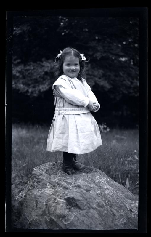 Film negative showing Marriott C. Morris' daughter Janet Morris as a young girl standing on a rock in a field at Pocono Lake. She smiles, wearing a white frock and ribbons in her hair. The Pocono Lake Preserve was pioneered by a group of Quakers, including Isaac Sharpless, who camped in the area in 1904. In 1908, this group bought the property from the Pocono Mountain Ice Company and designed it as a basic, rustic campground.