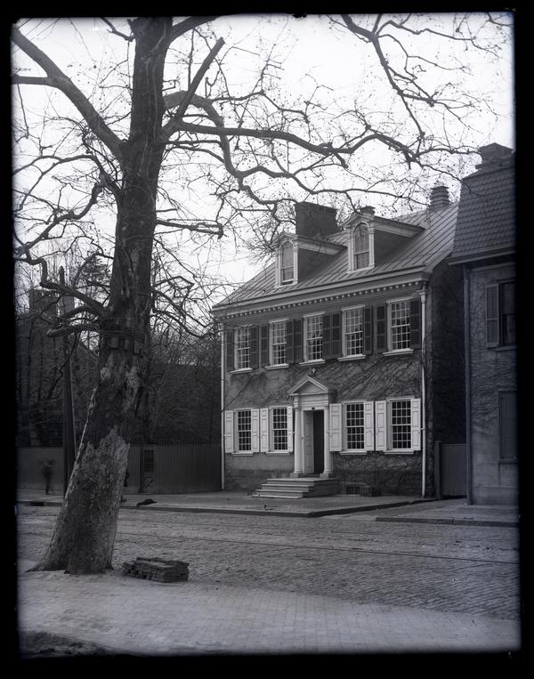 Glass negative showing a view of the two-story Deshler-Morris House at 5442 Germantown Avenue seen from across a brick road lined with trolley tracks. The house has shuttered windows and vines growing up its walls. A tall tree grows in the sidewalk on the opposite side of the street. David Deshler built the original four-room summer cottage on this Germantown lot in 1752, adding the three-story front addition in 1772. The house was sold to Col. Isaac Franks in 1792 after Deshler’s death. President George Washington rented the home for the duration of the yellow fever epidemic of 1793 and the summer of 1794. Elliston and John Perot purchased the house in 1804, selling it to Elliston’s son-in-law Samuel B. Morris after his death in 1834. The house stayed in the possession of the Morris family for over a century, when Elliston P. Morris donated the house to the National Parks Service in 1948. The name was officially changed to the Germantown White House in 2009.