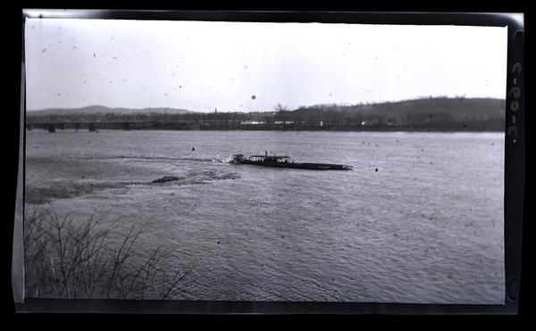 Film negative showing a barge floating down Susquehanna River at Harrisburg. A bridge spans the river and trees and other foliage grow on either side of the bank.
