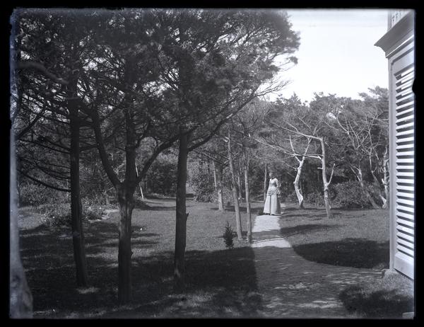Glass negative showing Marriott Morris' sister Elizabeth Canby Morris standing on a pathway running through a field behind a house. Narrow trees surround the path.