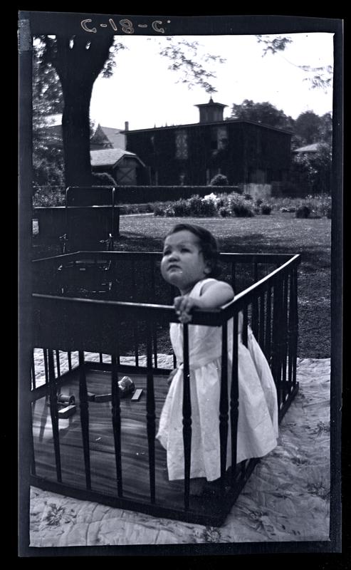 Film negative showing Marriott C. Morris' daughter Janet Morris as a baby in a playpen in the garden at their home at 131 W. Walnut Lane. She wears a loose, white frock. The playpen sits on a blanket in the grass. A house is visible behind the garden.
