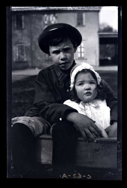 Film negative showing Marriott C. Morris's children Marriott Canby Morris Jr. as a boy and Janet Morris as a toddler seated in a wagon in the garden at their home at 131 W. Walnut Lane. Marriott Morris Jr. wears breeches and a cap while Janet Morris wears a cap tied with a ribbon under her chin. A house is visible behind them.