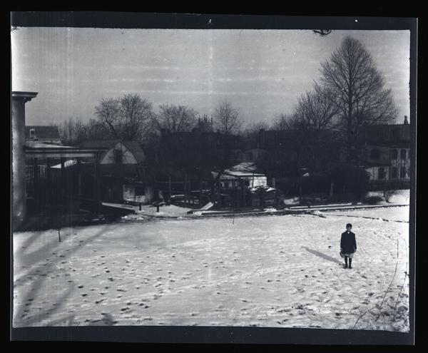 Film negative showing Marriott C. Morris' son Marriott Canby Morris Jr. as a boy standing in a snowy field, likely at their home at 131 W. Walnut Lane. Various houses stand in the background.