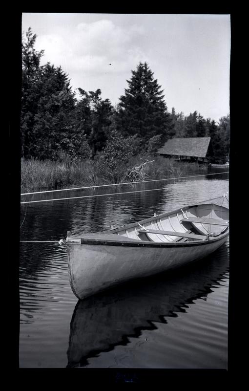 Film negative showing a canoe floating on Pocono Lake. Two ropes are strung across the lake over the canoe. The Pocono Lake Preserve was pioneered by a group of Quakers, including Isaac Sharpless, who camped in the area in 1904. In 1908, this group bought the property from the Pocono Mountain Ice Company and designed it as a basic, rustic campground.