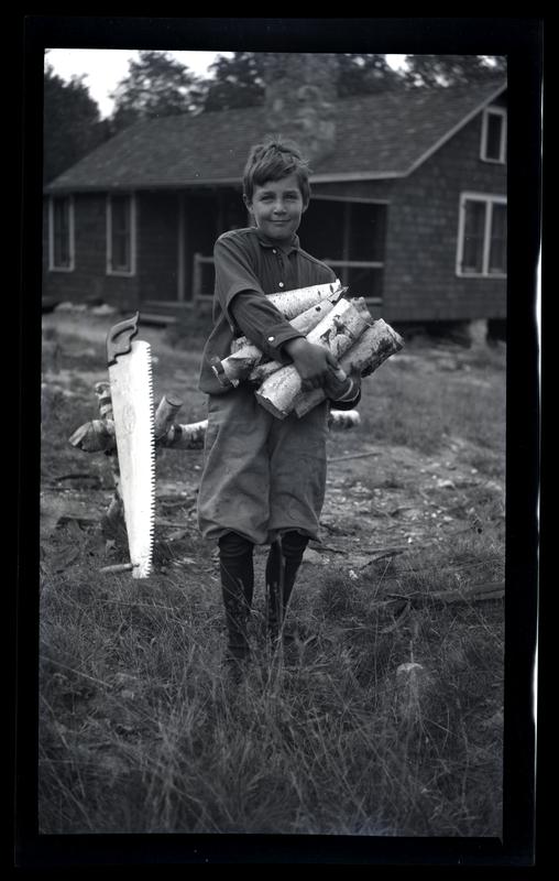 Film negative showing Marriott C. Morris' son Elliston Perot Morris Jr. as a boy carrying firewood at Pocono Lake. He wears a dark shirt and short pants. A saw is propped up against a makeshift sawhorse behind him and a wooden cabin stands in the background. The Pocono Lake Preserve was pioneered by a group of Quakers, including Isaac Sharpless, who camped in the area in 1904. In 1908, this group bought the property from the Pocono Mountain Ice Company and designed it as a basic, rustic campground.