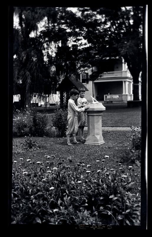 Film negative showing Marriott C. Morris' sons Elliston Perot Morris Jr. and Marriott Canby Morris Jr. as boys standing next to a stone sundial in the garden at their home at 131 W. Walnut Lane. Flowers grow in the foreground and their house stands in the background. A clothesline strung with linens extends from the side of the house.