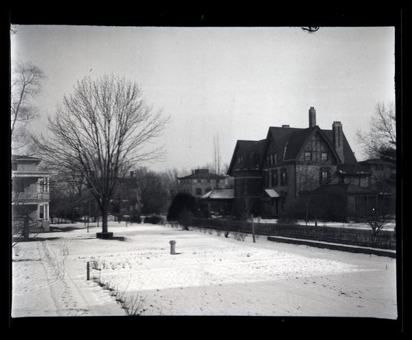 Film negative showing a yard covered in snow, likely at Morris' home at 131 W. Walnut Lane. A tree surrounded by a wooden bench stands in the yard to the right of a three-story house. Another large house stands on the right.