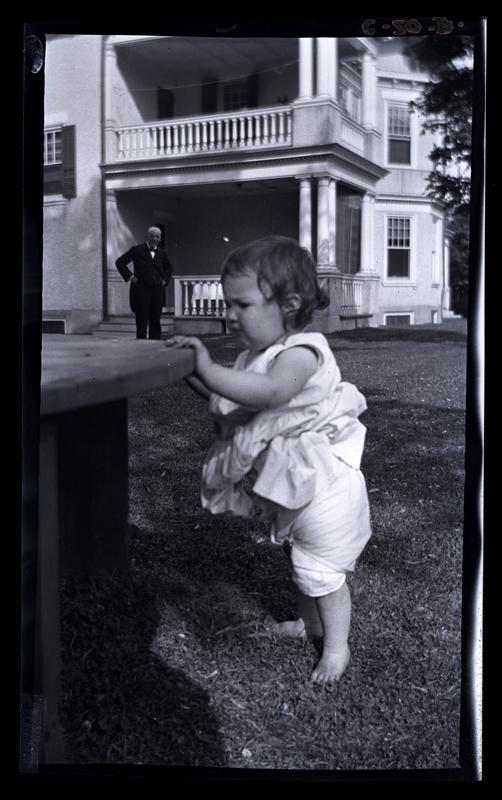 Film negative showing Marriott C. Morris' daughter Janet Morris as a baby propping herself up next to a wooden bench surrounding a tree at their home at 131 W. Walnut Lane. Morris' uncle-in-law Asa S. Wing stands near the entrance to the house in the background.