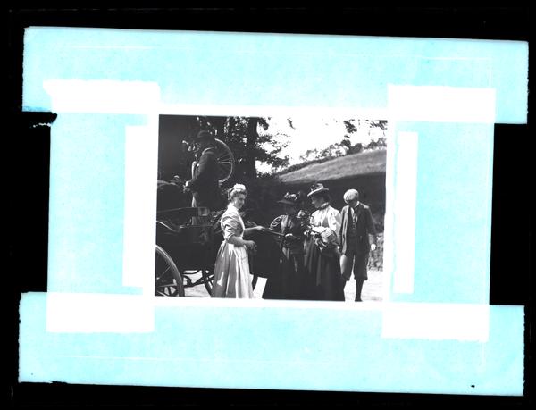 Glass negative showing three women taking trunks from the back of a wagon. A man stands behind the women and another man stands in the wagon holding a bicycle wheel.