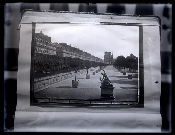 Glass negative showing a page of an open book with a photograph of Jardin des Tuileries. Straight rows of trees extend toward a large building in the distance as a statue of a man fighting a snake stands in the foreground. A stone wall and leafy shrubs border the garden on the left side. Behind the book is the unfocused pattern of a porch railing.