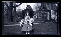 Film negative showing Marriott C. Morris' wife Jane Rhoads Morris and their daughter Janet Morris as a child standing in the garden at their home at 131 W. Walnut Lane. Janet Morris wears a coat trimmed with fur and Jane Morris wears glasses and a topknot in her hair. A small building with lattice walls stands on the right.