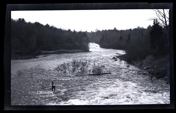 Film negative showing a man standing with a fishing rod in the center of a quickly moving river. Trees grow on either riverbank and a dead tree lays in the shallow water.