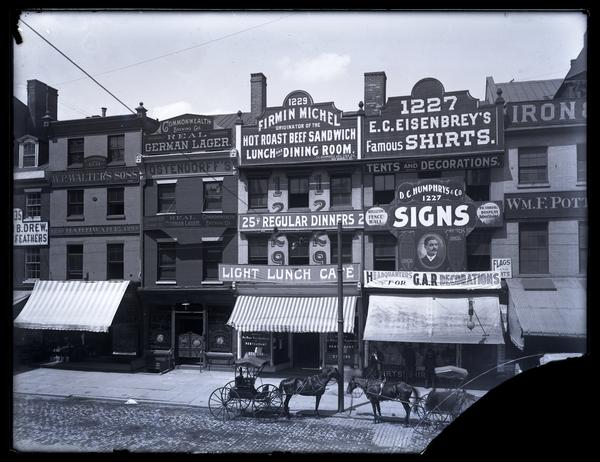 Glass negative a view of 1227-1235 Market Street. Horse-drawn carriages and carts stand on the cobblestone street. Awnings and large signs hang from the buildings. 1235 Market Street has a sign reading "[William] B. Drew [...] Feathers." 1233 Market Street has signs reading "Established 1831, W.P. Walter's Sons, 1233 Hardware 1233." 1231 Market Street has signs reading "Commonwealth Brewing Co., Real German Lager., Ostendorff's." 1229 Market Street has signs reading "Firmin Michel originator of the hot roast beef sandwich Lunch and Dining Room. D.C. Humphreys Adv. Sign Co., 1227 Market St., 25c Regular Dinners, Light Lunch Cafe." 1227 Market Street has signs reading "E.C. Eisenbrey's Famous Shirts., Tents and Decorations, D.C. Humphrys & Co. 1227 Signs, Headquarters for G.A.R. Decorations."
