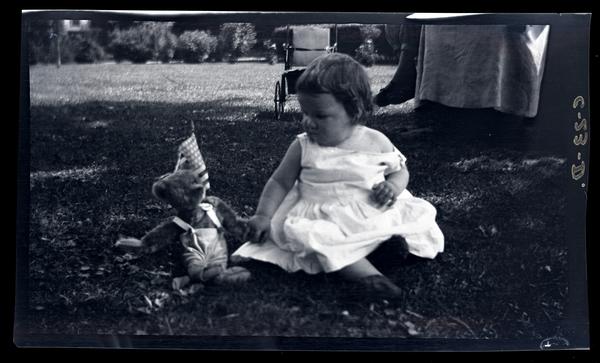 Film negative showing Marriott C. Morris' daughter Janet Morris as a baby in the garden at their home at 131 W. Walnut Lane. She wears a white frock and sits in the grass next to a teddy bear and an American flag. A carriage and various shrubs are visible in the background behind her.