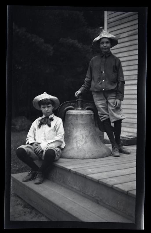 Film negative showing Marriott C. Morris' sons Marriott Canby Morris Jr. and Elliston Perot Morris Jr. as boys on a porch at Pocono Lake with a large bell. Marriott Morris Jr. on the left sits on a step while Elliston Morris Jr. on the right stands leaning against the bell. They wear short pants and straw hats. The Pocono Lake Preserve was pioneered by a group of Quakers, including Isaac Sharpless, who camped in the area in 1904. In 1908, this group bought the property from the Pocono Mountain Ice Company and designed it as a basic, rustic campground.