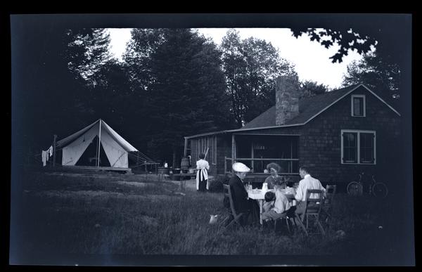 Film negative showing a group sitting around a table outside a cabin at Pocono Lake. A woman walks away from the table back toward the cabin. A tent is strung up to the left of the building. The Pocono Lake Preserve was pioneered by a group of Quakers, including Isaac Sharpless, who camped in the area in 1904. In 1908, this group bought the property from the Pocono Mountain Ice Company and designed it as a basic, rustic campground.