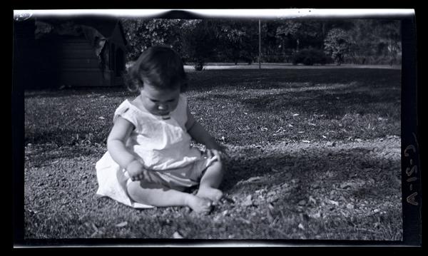 Film negative showing Marriott C. Morris' daughter Janet Morris as a baby sitting in the grass in the garden at their home at 131 W. Walnut Lane. She wears a loose, white frock and looks down at her feet.