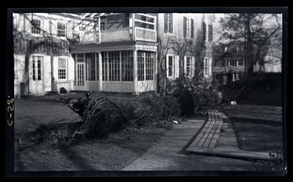 Film negative showing the rear of the Deshler-Morris House at 5442 Germantown Avenue. The house has shuttered windows, walls covered in ivy, and a balcony on the second floor. A fallen tree covered in vines lies across the garden. David Deshler built the original four-room summer cottage on this Germantown lot in 1752, adding the three-story front addition in 1772. The house was sold to Col. Isaac Franks in 1792 after Deshler’s death. President George Washington rented the home for the duration of the yellow fever epidemic of 1793 and the summer of 1794. Elliston and John Perot purchased the house in 1804, selling it to Elliston’s son-in-law Samuel B. Morris after his death in 1834. The house stayed in the possession of the Morris family for over a century, when Elliston P. Morris donated the house to the National Parks Service in 1948. The name was officially changed to the Germantown White House in 2009.