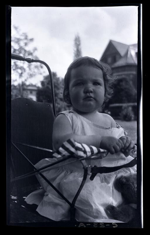 Film negative showing Marriott C. Morris' daughter Janet Morris as a baby sitting in a carriage in the garden at their home at 131 W. Walnut Lane. She wears a white frock and holds a small American flag in her hands. A house is visible behind her.