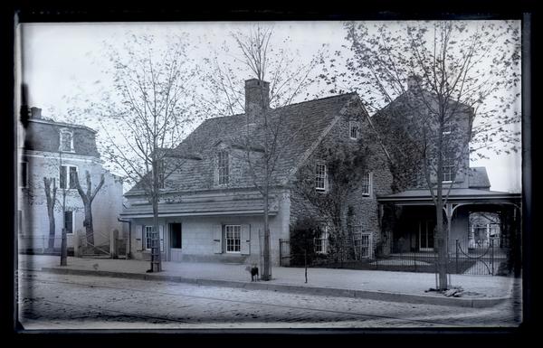 Glass negative showing the King Property, a two-story stone house with a steep roof, at 5411 Germantown Avenue. Trolley tracks run down the center of the brick road. A dog stands beneath one of the trees growing in planters along the sidewalk. Rev. John William Runkle occupied the residence in 1809. It became known as the King property for later owner Joseph King. St. Luke’s Church purchased the property between 1869 and 1873, and it eventually became a part of the church’s lawn.