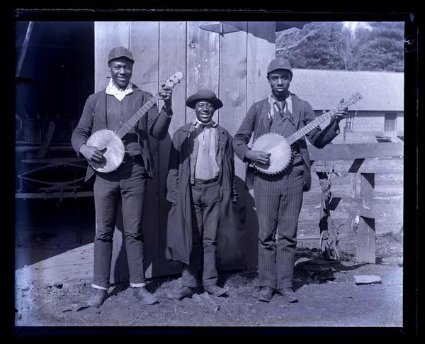 Glass negative showing three young African American men posing in front of a wooden fence behind the Swannanoa Hotel. In the left, the man, attired in a cap, a scarf, a waistcoat, a jacket, pants with the bottoms rolled up, shoes, and a wedding ring, smiles and looks at the viewer as he holds a banjo. In the center, the shorter, young man, attired in a brimmed hat, a white shirt, a checked jacket, a coat, pants, and shoes, smiles and looks at the viewer with his hands in his coat pockets. The man in the right, attired in a cap, a collared shirt, a tie, a scarf, a waistcoat, a jacket, striped pants, and shoes, looks at the viewer and holds a banjo.