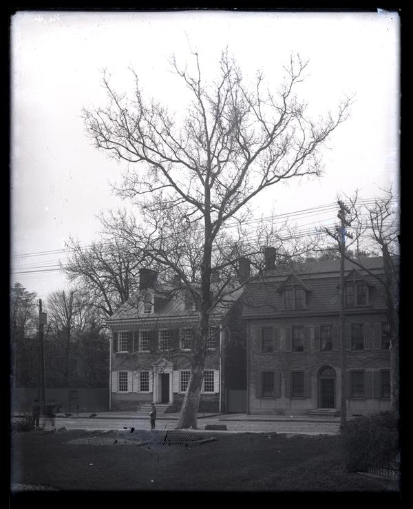 Glass negative showing a large buttonwood tree planted by Marriott C. Morris' grandfather Samuel B. Morris and growing in Market Square. Two buildings, including the Deshler-Morris House at 5442 Germantown Avenue, stand across the brick road from the square A man stands beneath the tree looking to the left toward two other people standing near the road. First called The Green, Market Square was established from land originally owned by James De la Plaine as early as 1703. As a center of community activity, Market Square contained not only market stalls but also the prison and stocks. Samuel B. Morris planted many of the Square’s original trees. Prominent buildings situated around the Square include the German Reformed Church and the Fromberger-Harkness House. David Deshler built the original four-room summer cottage on this Germantown lot in 1752, adding the three-story front addition in 1772. The house was sold to Col. Isaac Franks in 1792 after Deshler’s death. President George Washington rented the home for the duration of the yellow fever epidemic of 1793 and the summer of 1794. Elliston and John Perot purchased the house in 1804, selling it to Elliston’s son-in-law Samuel B. Morris after his death in 1834. The house stayed in the possession of the Morris family for over a century, when Elliston P. Morris donated the house to the National Parks Service in 1948. The name was officially changed to the Germantown White House in 2009.