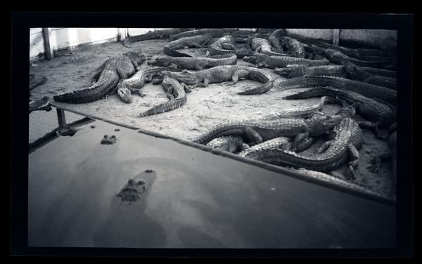 Film negative showing a swarm of alligators in a pen, likely at Jacksonville, Florida. Some alligators lay in the sand while others float in a small pool.